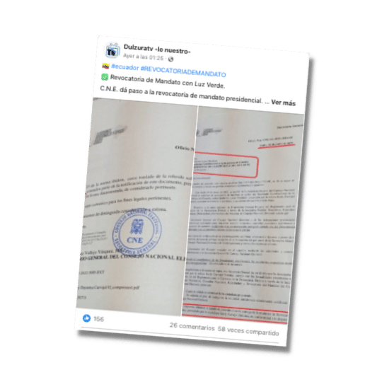 Un grupo de ciudadanos conformó el mes pasado la Coordinadora Nacional para la revocatoria de mandato, coalición liderada por Pedro Granja y Joselo Argüello. Con esta información, una página de Facebook publicó que el Consejo Nacional Electoral (CNE) dio paso a la revocatoria de Lasso. Según el post, faltan pocos días para que los formularios se distribuyan por todo el país y el proceso continúe. La información es engañosa. El CNE aceptó recién a trámite el pedido de revocatoria. Será el Pleno del Consejo el que resuelva si se acepta o no la entrega de formularios y recolección de firmas, decisión que aún no ha sido tomada.