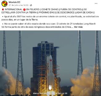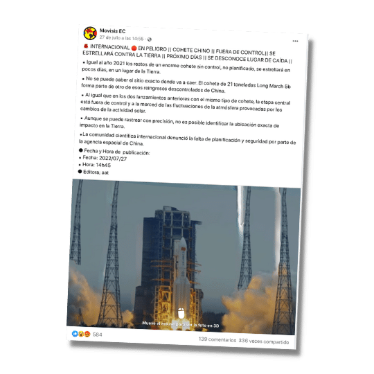 En facebook circula una publicación en la que se asegura que un nuevo cohete chino Long March 5B estaría fuera de control e impactará a la Tierra. Se asegura, además, que el lugar y la fecha se desconoce, pero dicen que será en los próximos días. Esta información es cierta.