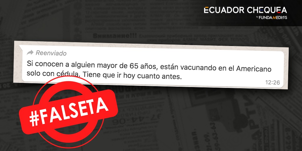 Un mensaje que circula por WhatsApp indica que: “si conocen a alguien mayor de 65 años, están vacunando en el Americano solo con cédula. Tienen que ir cuanto antes”. Este anuncio es falso. El Ministerio de Salud Pública (MSP) informó que solo las personas con discapacidad mayor a 50% o con enfermedades catastróficas pueden acercarse sin cita.