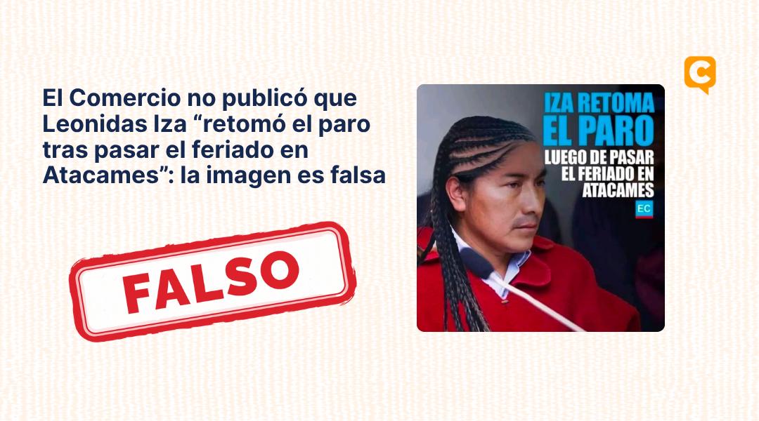 En Facebook circula una imagen con los logotipos y la tipografía de El Comercio, en la que se afirma que “Leonidas Iza retomó el paro luego de pasar el feriado en Atacames”. El contenido busca aparentar una captura real del medio de comunicación.
