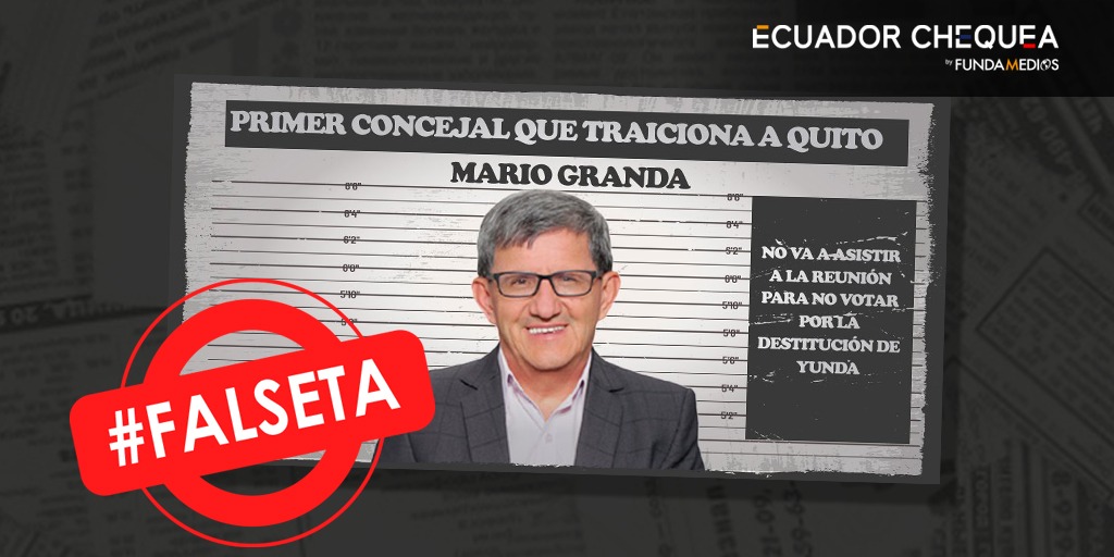La posible remoción del alcalde de Quito, Jorge Yunda, es analizada este 2 de junio de 2021 en la sesión extraordinaria del Concejo Metropolitano de Quito número 147. En ese contexto, desde cuentas de Twitter como Resistencia Quito se informó que “el edil Mario Granda no asistirá a la sesión para “no votar en contra ni a favor de Jorge Yunda”. La información es falsa. Granda está convaleciente de salud y su ausencia fue notificada formalmente.