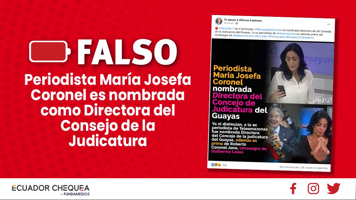 Una página en Facebook publicó que la periodista María Josefa Coronel fue nombrada como Directora del Consejo de la Judicatura del Guayas. La información es falsa. El Consejo de la Judicatura se encuentra en proceso de selección para el cargo y todavía no hay una resolución al respecto.