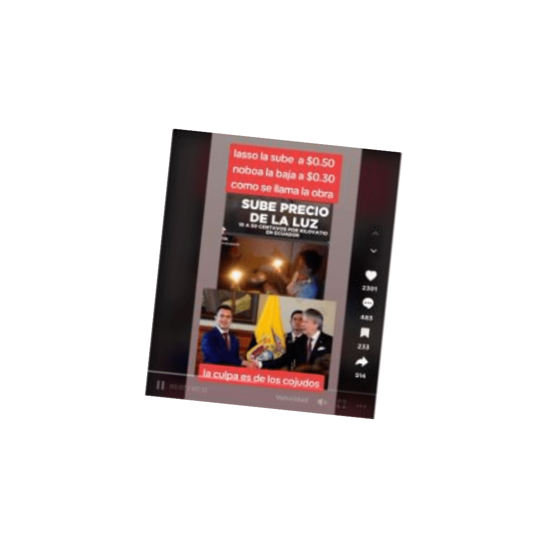La publicación presenta una imagen en la que se ve a Daniel Noboa y Guillermo Lasso. Esto, acompañado de un texto en el que se asegura que el precio de la luz subió «de 10 a 50 por kilovatio en Ecuador». Además, el post afirma que el presidente Lasso sube la electricidad a $ 0,50 y que Noboa la bajará a $ 0,30. El video no presenta ninguna prueba de lo que asegura, más allá de lo que se ve en pantalla.