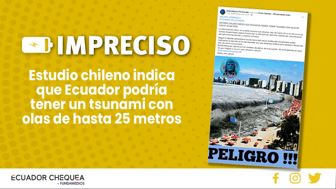En la cuenta de Facebook Apocalipsis Peninsular se difundió información de que un estudio del Programa de Riesgo Sísmico de la Universidad de Chile indica que Ecuador podría llegar a tener, de darse las condiciones alguna vez, un tsunami con olas de hasta 25 metros. La información es imprecisa, porque, ciertamente, el estudio existe y se refiere a una posibilidad, pero el Instituto Oceanográfico y Antártico de la Armada (Inocar) no contempla un escenario similar de acuerdo a sus proyecciones. Al tratarse de un evento sísmico, dada su impredecibilidad, no se predecir.