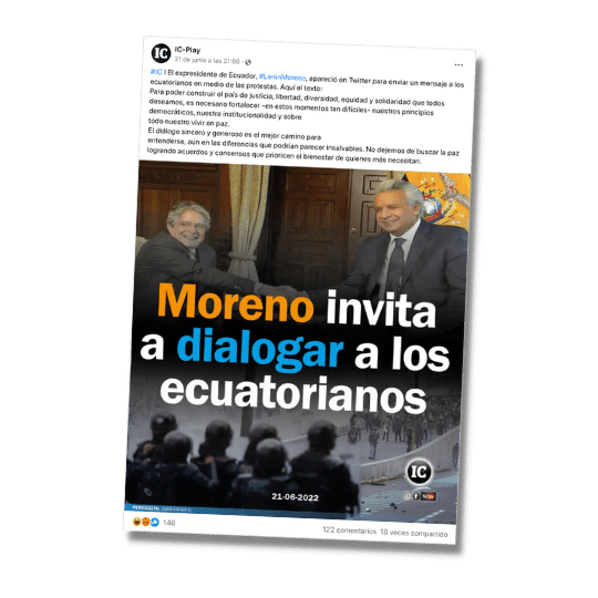 La Confederación de Nacionalidades Indígenas del Ecuador, Conaie y el Gobierno han tenido momentos de tensión durante el paro nacional, que inició el 13 de junio. Bajo este contexto, una página de Facebook publicó que el expresidente, Lenín Moreno invitó a dialogar a los ecuatorianos. La información es cierta, pues Moreno publicó una carta a través de su cuenta de Twitter.