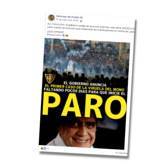 En redes sociales se ha difundido desinformación de que próximamente llegará un paro nacional. Una página de facebook publicó que el Gobierno acaba de anunciar el primer caso de la viruela de mono justo antes de que inicie ese supuesto paro. Esto es falso. Para empezar, no se ha confirmado aún ningún caso de viruela del mono en el país; existe un caso sospechoso, pero los resultados de los estudios aún no se han dado. Además, no se ha anunciado un paro —que implica paralización productiva y de servicios—, sino una movilización en contra de las políticas del Gobierno de Guillermo Lasso.