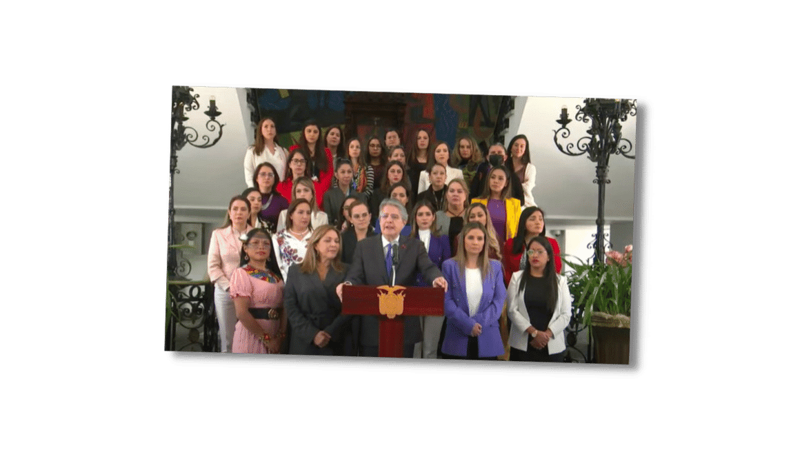 El presidente, Guillermo Lasso, citó a los medios de comunicación a una rueda de prensa en el Palacio de Carondelet, que estaba prevista para las 11:00, pero empezó casi a las 12:00. Lasso no se presentó sólo con su esposa, María de Lourdes Alcívar, como es de costumbre; sino que, frente a las cámaras lo acompañaron 32 mujeres de la función ejecutiva a su alrededor.