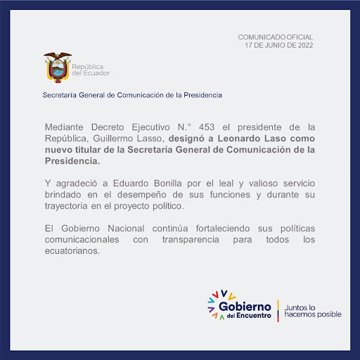 En horas de la tarde de hoy, a través de la cuenta oficial de Twitter de la Secretaría de Comunicación, se informó que mediante el Decreto Ejecutivo N° 453 el presidente, Guillermo Lasso, designó a Leonardo Laso como titular de esta Secretaría.