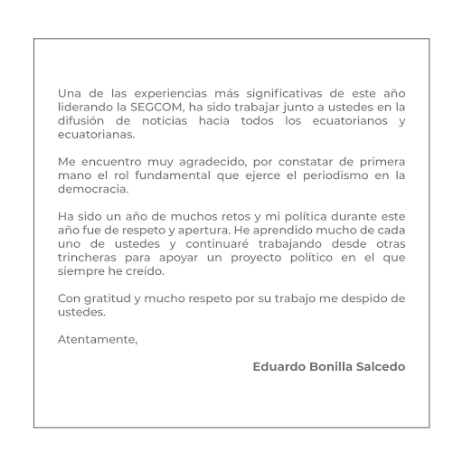 Eduardo Bonilla, quien se desempeñaba como secretario de Comunicación de la Presidencia, renunció a su cargo, que ocupó desde mayo del 2021. La renuncia fue confirmada por el propio Bonilla, a través de un tuit, y luego por el Gobierno.