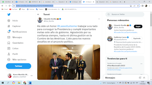Bonilla publicó un Tuit, en el que menciona: “Ha sido un honor trabajar a su lado para conseguir la Presidencia y cumplir importantes metas este año de Gobierno. Agradecido por su confianza siempre, hasta mi última gestión en la Cumbre de las Américas. Listo para los nuevos desafíos en el proyecto político”, escribió.