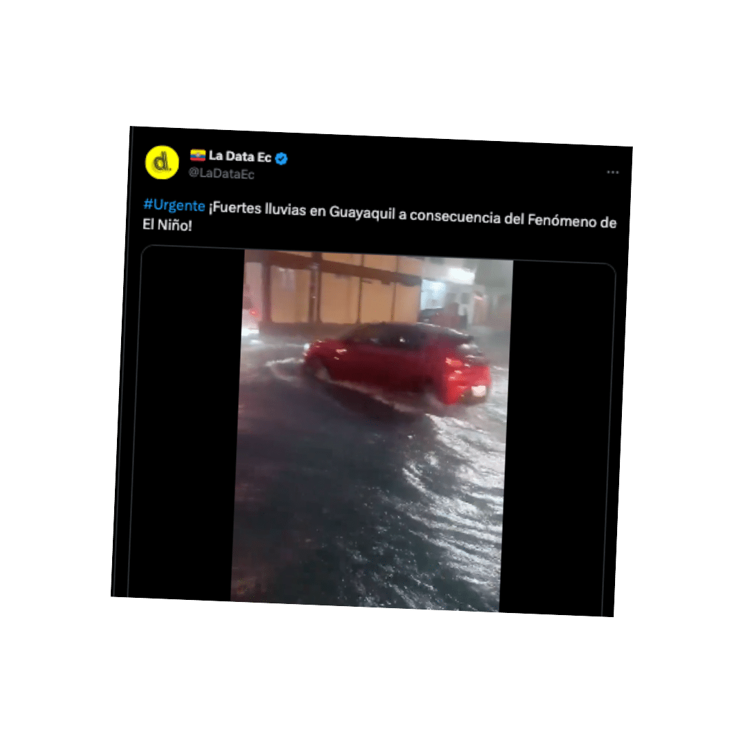 Producto de las inundaciones, en redes sociales se han realizado varias publicaciones que aseguran que las fuertes lluvias que se registraron en la ‘Perla del Pacífico’ fueron consecuencia del Fenómeno de El Niño. También, se ha mencionado que por causa de este fenómeno las lluvias continuarán y se intensificarán mientras llega septiembre. Calificamos este contenido como falso. Las fuertes lluvias sí se registraron en Guayaquil, sin embargo, estas no son a causa de este fenómeno, sino por el cambio climático.