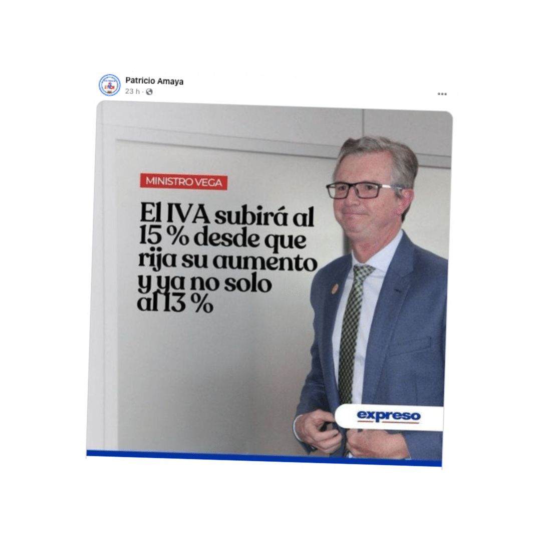 Una confusa publicación en Facebook asegura que los ecuatorianos tendrán que pagar el 16% de impuestos y que la consulta popular impulsada por el presidente, Daniel Noboa, costará $80 millones. Se califica este contenido como falso. Los datos presentados son erróneos. Además contiene un claro sesgo político. Al decir que “todo es por capricho del príncipe Noboa”. El Gobierno informó que el IVA subirá a 13% automáticamente publicada la Ley que aprobó la Asamblea (aunque la propia Ley deja abierta la puerta para que suba hasta el 15% en cualquier momento) y la consulta popular costará $60 millones, no 80.