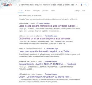 Al colocar la frase atribuida a las declaraciones del candidato, Lasso en Google tan solo se obtuvo páginas web que publicaron lo sucedido con el mencionado tuit.