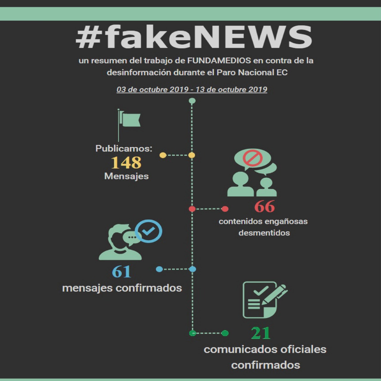 A la convulsión social que fue encendida en las calles por delincuentes que aprovecharon las movilizaciones sociales para saquear, agredir e impedir el desarrollo del trabajo periodístico en Ecuador, se sumó una ola agresiva de desinformación. Durante las jornadas del paro nacional el trabajo de Ecuador Chequea, de FUNDAMEDIOS, se multiplicó aproximadamente en un 200%. De un promedio de 20 mensajes engañosas desmentidos en un lapso de 11 días, pasamos a más de 60.