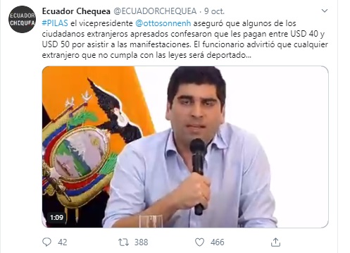 En repetidas ocasiones los usuarios nos llenaban de mensajes en torno a un ficticio acuerdo entre los movimientos sociales indígenas y el Gobierno. Pese a que el mensaje fue recurrente, el 11 de octubre el mismo fue compartido por distintos medios convencionales y digitales. El anuncio era clave: “Conaie acepta diálogo con el Gobierno”, pero lastimosamente el acuerdo no era real.