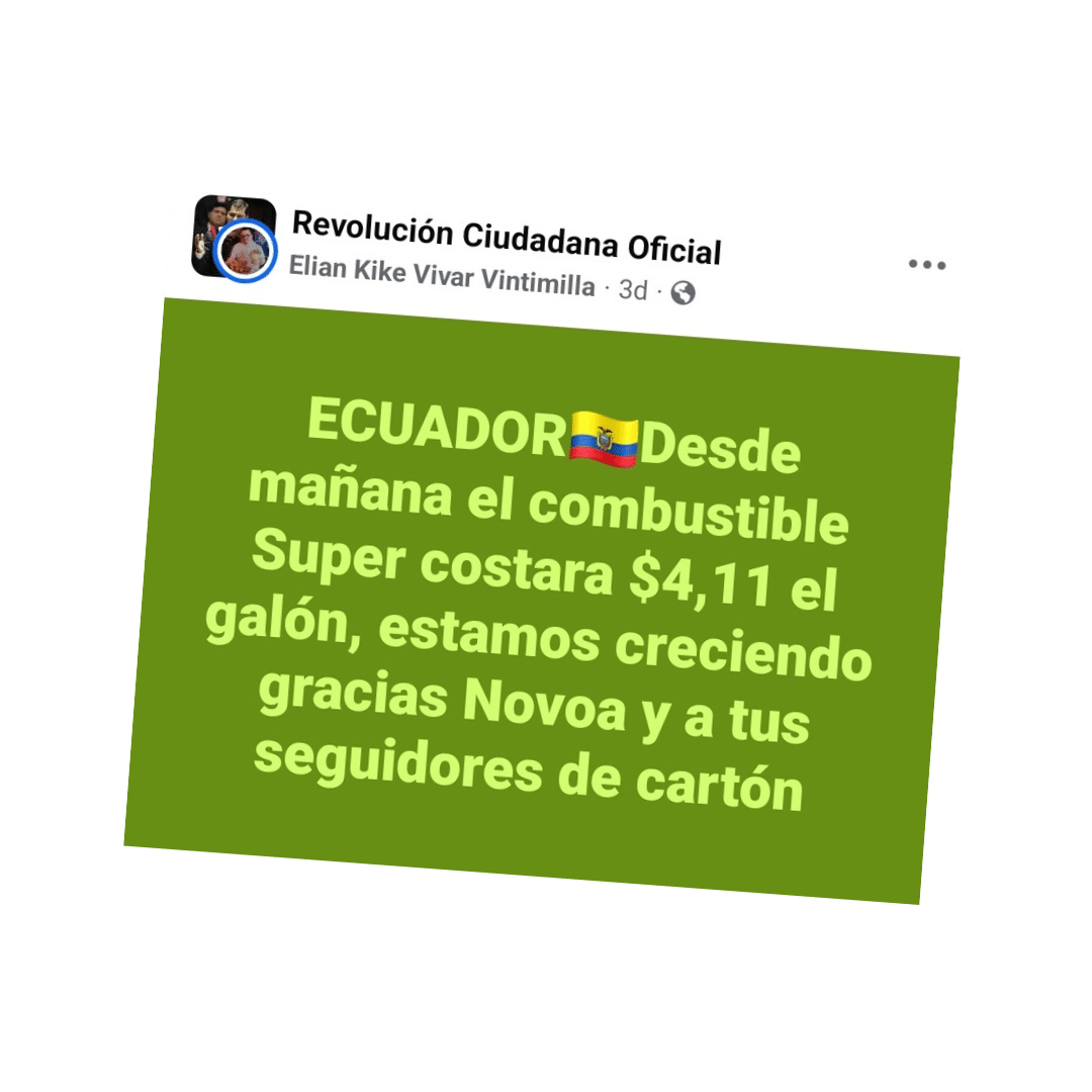 Una publicación de Facebook asegura que desde el 17 de junio la gasolina súper subió de precio, por lo que ahora cuesta $4,11 cada galón gracias al presidente, Daniel Noboa. Se califica al contenido como engañoso. Este tipo de gasolina no cuenta con un subsidio, por lo que su precio depende de los costos internacionales. Por eso, Petroecuador sugiere un precio que es actualizado mensualmente con el sistema de bandas.