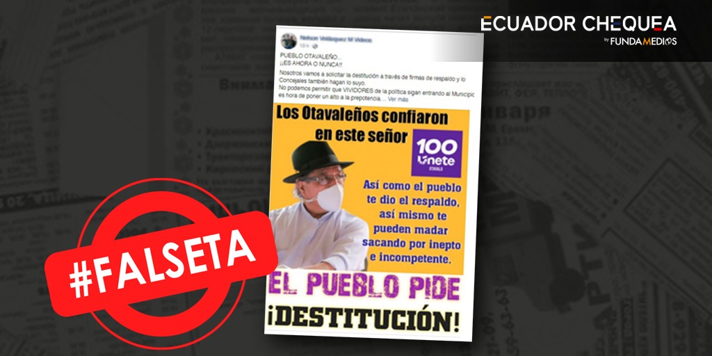 El 8 de junio de 2021, desde una cuenta personal de Facebook se publicó una imagen del alcalde del cantón Otavalo, Mario Conejo Maldonado, con un mensaje “El pueblo pide destitución”. La afirmación es falsa. En el Consejo Nacional Electoral (CNE) de la provincia de Imbabura no existe ninguna solicitud de revocatoria del mandato al alcalde de Otavalo, Mario Conejo.