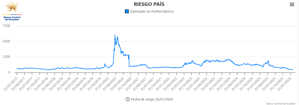 • El 28 de enero de 2026, fecha en la que se realizó la intervención del presidente, el riesgo país de Ecuador se ubicaba en 414 puntos.