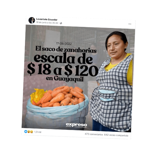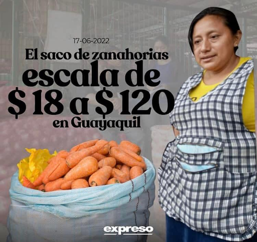 Cerca de 100 vías a nivel nacional se han cerrado producto de las manifestaciones convocadas por la Conaie. La mayoría de las calles pertenecen a la región Sierra. Con esta información, una página de Facebook publicó, sin aportar ningún otro contexto, que el saco de zanahorias escala de USD 18 a USD 120 en Guayaquil. Esto es impreciso. El post se basa en una nota de diario Expreso en la que, en efecto, se reporta la subida de precios en productos de la Sierra, pero no sólo a la zanahoria. Además, los precios cambian dependiendo del mercado en el que se venda y del puesto, según la propia nota. Pero, los comerciantes sí han reportado un incremento en los precios.