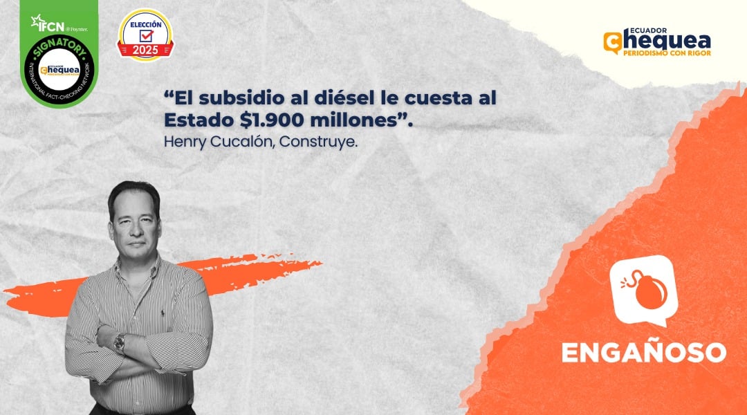 Henry Cucalón, candidato a la Presidencia por Construye, dijo en una entrevista en el medio digital GK: “El subsidio al diésel al Estado le cuesta $ 1.900 millones, de un subsidio ineficaz”. Esto, tras una pregunta realizada por la entrevistadora en la que se le cuestiona sobre las soluciones económicas que se dará al país en su posible Gobierno.