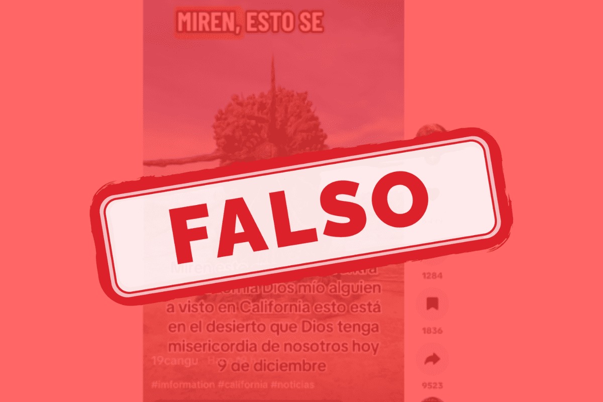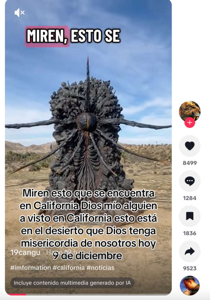 Un video viral de TikTok asegura que una criatura de apariencia monstruosa fue hallada en el desierto de California el 9 de diciembre. La publicación usa un clip generado digitalmente y lo presenta como si se tratara de un hallazgo real. No existe ningún registro oficial, mediático o ciudadano que confirme la presencia de un objeto similar en California. Además, el propio video está etiquetado por TikTok como “contenido multimedia generado por IA”. La afirmación de que el “monstruo” existe en el desierto californiano es falsa.