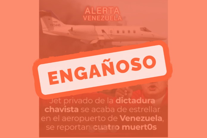La afirmación es engañosa: no hubo ningún accidente aéreo ese día y el contenido se basa en imágenes reales de un siniestro ocurrido meses antes, el 24 de septiembre de 2025, cuando un Learjet 55 cayó tras despegar de Maiquetía, pero presentadas como si fueran actuales. Además, el video incorpora la etiqueta política “jet chavista”, inexistente en reportes oficiales, con el fin de inducir interpretaciones no sustentadas.