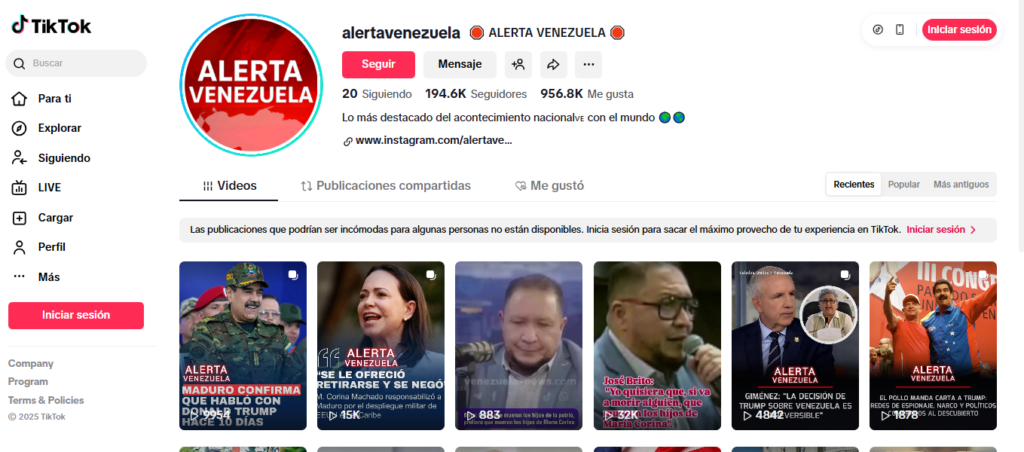 El contenido fue publicado por el usuario @alertavenezuela, en TikTok mediante publicaciones que replican el mensaje sin evidencia verificable.