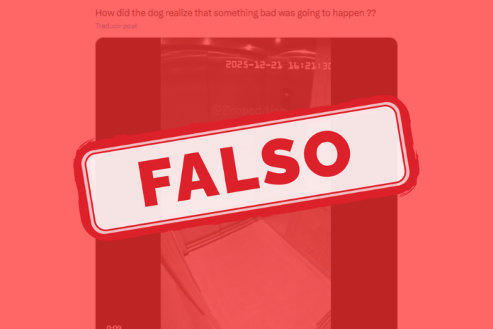 Un video viral difundido como si fuera una grabación de cámara de seguridad (CCTV) sugiere que un perro anticipó un hecho negativo antes de que ocurriera algo dentro de un ascensor. No existe evidencia verificable de que el video muestre un evento real ni de que el animal haya anticipado un peligro, por lo que la afirmación es falsa.