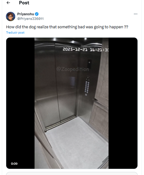 En redes sociales, principalmente en X, circula un clip acompañado del texto: “How did the dog realize that something bad was going to happen??”. El planteamiento induce a creer que el animal predijo un suceso real y que el video corresponde a una grabación auténtica de seguridad.