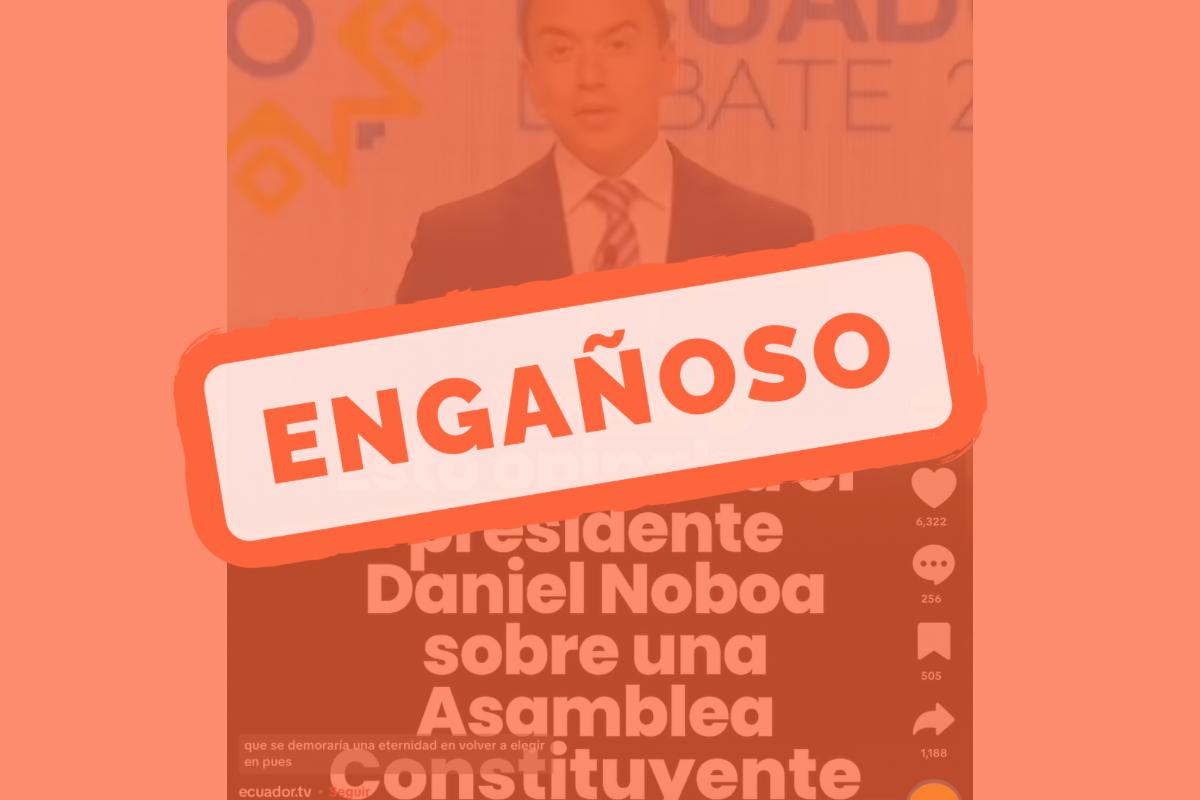 Pero el clip es antiguo y fue grabado cuando Noboa era candidato presidencial en 2023. La pieza omite que, para 2025, Daniel Noboa, propuso una Asamblea Constituyente y que su declaración correspondía a un contexto totalmente distinto: una campaña electoral marcada por la muerte cruzada y un eventual gobierno de apenas 17 meses. Por eso, la afirmación es engañosa.