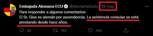 La aclaratoria de las autoridades consulares alemanas en Ecuador se hizo en el contexto de la ayuda consular que las dependencias germanas le brindan a sus ciudadanos en procesos judiciales. Además, 24 horas después, en la misma publicación pero en un comentario informó que esta asistencia consular se está brindando a Glas “desde hace años”.