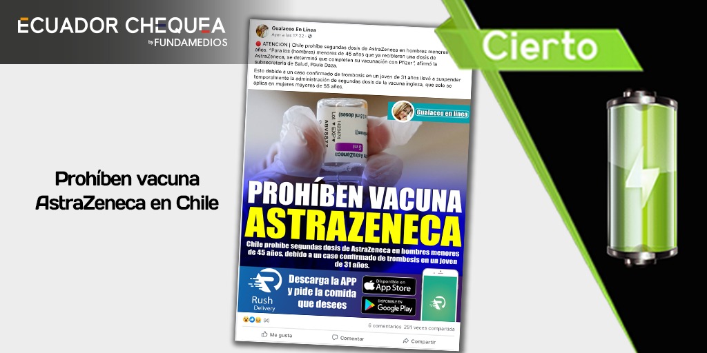 Este 14 de junio de 2021, se compartió una publicación desde una página de Facebook llamada Gualaceo en Línea. El contenido asegura que prohíben la segunda dosis de la vacuna AstraZeneca en Chile, debido a un caso confirmado de trombosis en un joven de 31 años. La información es cierta.