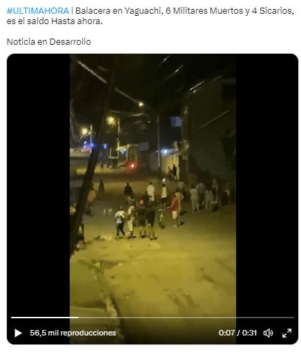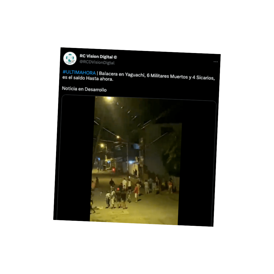 En Twitter circula una publicación que afirma que anoche hubo una balacera en Yaguachi, con un resultado de al menos 6 militares y 4 sicarios muertos. En el video se observa a varias personas que miran lo que sucede y se escuchan disparos, mientras se ven unos autos que parecen ser patrullas policiales. Calificamos este contenido como falso.