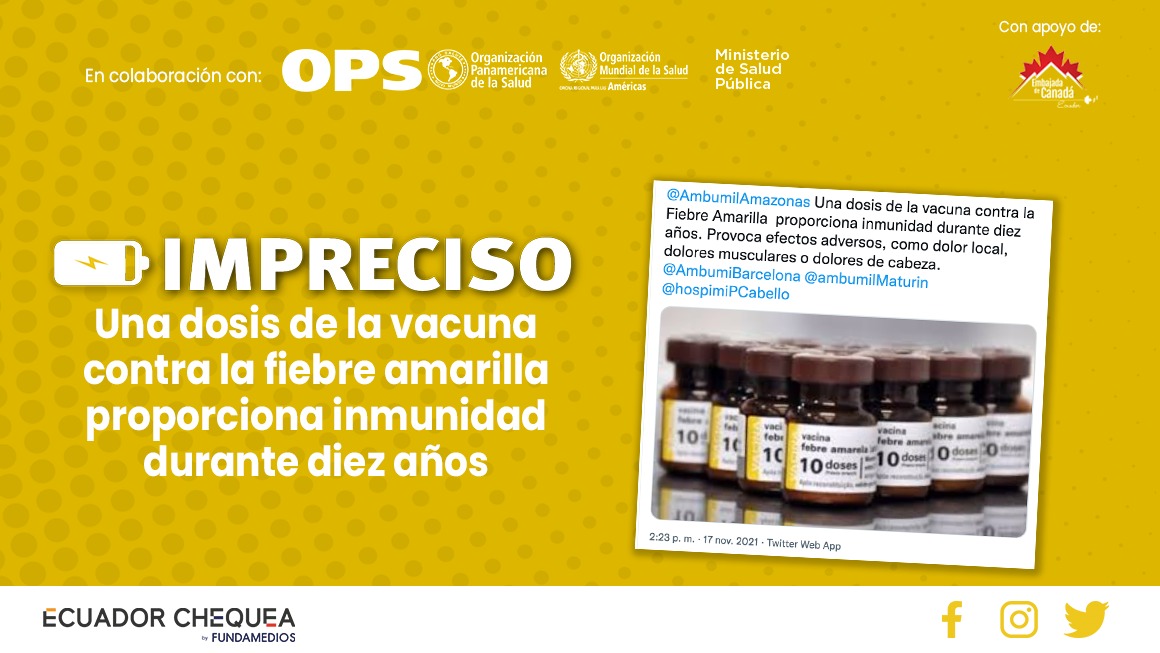 Una publicación en Twitter se asegura que una dosis de la vacuna contra la fiebre amarilla proporciona inmunidad durante 10 años. La información es imprecisa, pues en la mayoría de casos, según la Organización Mundial de la Salud (OMS), la protección puede durar toda la vida.