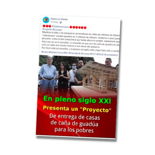 En una publicación de Facebook se asegura que, a pesar de estar en pleno siglo XXI, el Gobierno entrega este tipo de viviendas hechas a base de caña de bambú, mientras, la élite, banqueros y asesores se benefician con miles de millones de dólares por parte del Estado. Esta información es engañosa.