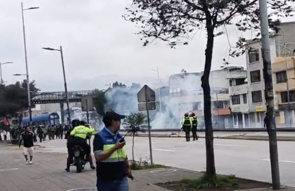 Tras el bloqueo, agentes policiales lanzaron bombas aturdidoras, de humo y gases lacrimógenos para dispersar a los manifestantes en La Villaflora. Los manifestantes permanecen en calles transversales intentando reagruparse.