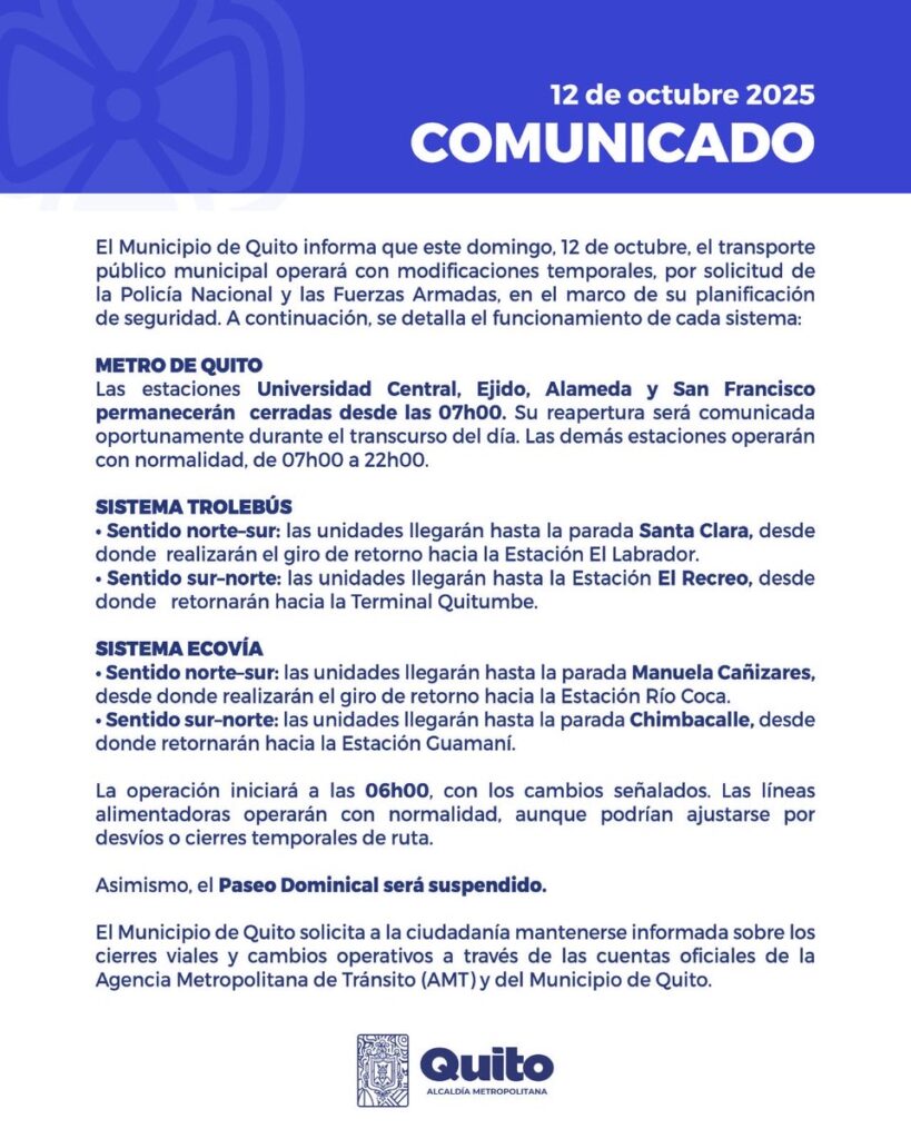 Este domingo, 12 de octubre, los sistemas metropolitanos de transporte Metro, Trolebús y Ecovía tendrán variaciones en sus rutas, por pedido de la Policía y las Fuerzas Armadas. También se suspende el paseo dominical. Hoy está prevista una marcha de sectores sociales desde La Villaflora hasta El Arbolito. Y otra marcha desde Cayambe a Quito.