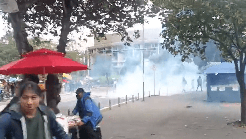 La fuerzas de seguridad lanzan bombas lacrimógenas, cerca del Colegio Montufar. Incluso, miembros de la Policía lanzaron piedras para disuadir el paso de los manifestantes que avanzan a pesar de los bloqueos.