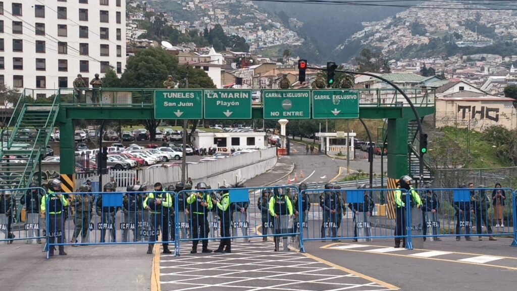 Policías y militares mantienen cercos en varios sectores del estratégico intercambiador de El Trébol, en Quito. Los uniformados se ubican en las bocacalles de la avenida José Velasco Ibarra, que conecta con la avenida Napo, en el centro sur, y con el sector de La Vicentina, en el centro oriente, así como en la avenida Pichincha, que enlaza con La Marín, en el centro histórico.