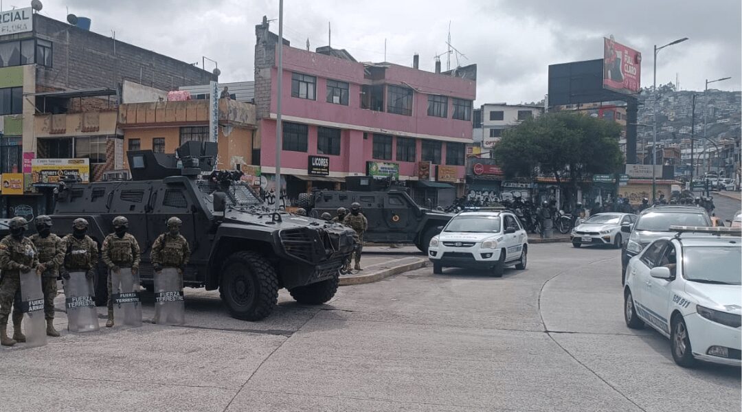 Policías y militares mantienen cercos en varios sectores del estratégico intercambiador de El Trébol, en Quito. Los uniformados se ubican en las bocacalles de la avenida José Velasco Ibarra, que conecta con la avenida Napo, en el centro sur, y con el sector de La Vicentina, en el centro oriente, así como en la avenida Pichincha, que enlaza con La Marín, en el centro histórico.