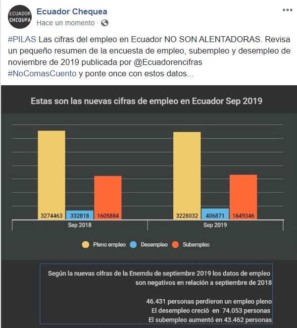 Este miércoles 16 de octubre tras la explosión social que causó la medida del retiro del subsidio de los combustibles, la Encuesta Nacional de Empleo, Desempleo y Subempleo (Enemdu) trajo más malas noticias. Y la mala nueva es que el desempleo creció en 74 mil 053 personas, el subempleo obtuvo el mismo comportamiento hacia el alza y afectó a 43 mil 462 persona,s además de que 46 mil 431 personas perdieron su condición de pleno empleo.