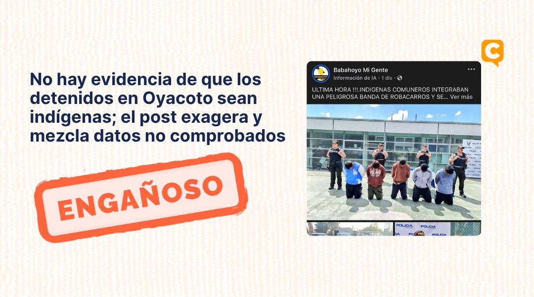 La información original proviene de la página de Facebook Babahoyo Mi Gente. El contenido toma como base un reporte real de la Policía Nacional sobre la detención de cinco personas en Oyacoto, pero añade elementos no incluidos en los comunicados oficiales, como la supuesta pertenencia indígena de los detenidos y un enfrentamiento con la comunidad bajo formas de justicia indígena.