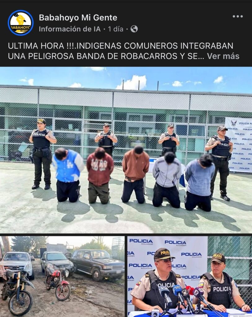 El post de Babahoyo Mi Gente (19/10/2025) llama “indígenas comuneros” a los aprehendidos, sostiene que “los comuneros pedían” juzgarlos y califica de “repugnante justicia indígena”. Afirma que se recuperaron “cinco vehículos”, que se incautó un “revólver calibre .32” y que “todos” carecían de antecedentes. El contenido usa lenguaje despectivo que asocia identidad indígena con criminalidad.