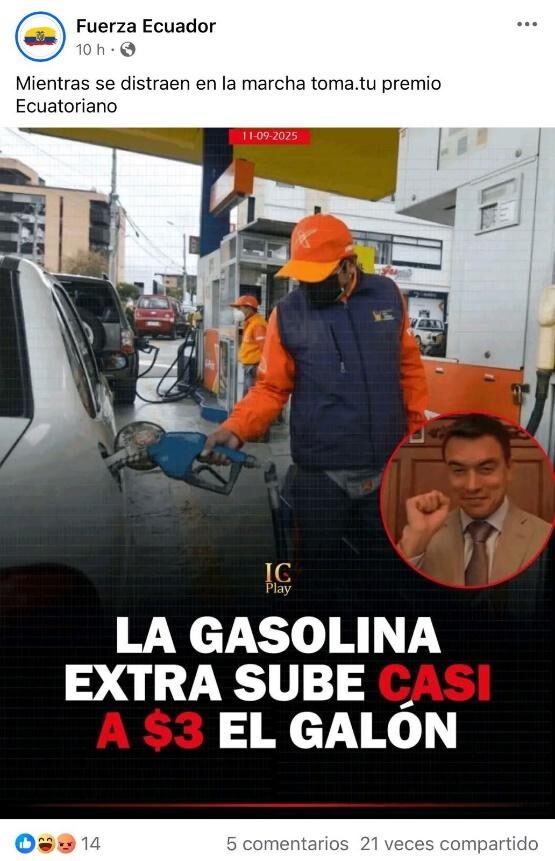 El post describe: “Mientras se distraen en la marcha toma tu premio, ecuatoriano”, además de colocar una fotografía del presidente, Daniel Noboa. Aunque esto muestra un sesgo político, el valor que dan es real, por eso lo calificamos como cierto. Te explicamos, el por qué del aumento del precio de las gasolinas.
