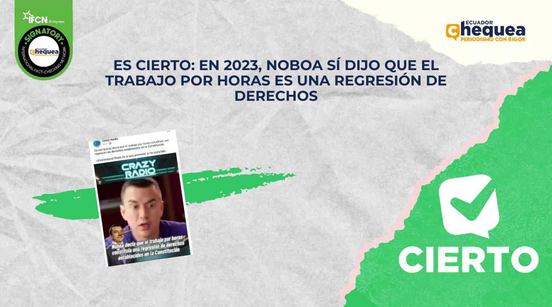 Al respecto, un post en Facebook asegura que el presidente, Daniel Noboa, decía que el trabajo por horas es una regresión de derechos. Se califica este contenido como cierto. Daniel Noboa sí dijo lo que se le atribuye. Lo hizo el 28 de julio de 2023, cuando era candidato presidencial. En ese entonces, habló de la competitividad en el país y sus ideas de llegar a la Presidencia. “No podemos topar la parte laboral, porque es regresión de derechos, por más que la gente siga hablando del trabajo por horas, es regresión de derechos”, dijo.