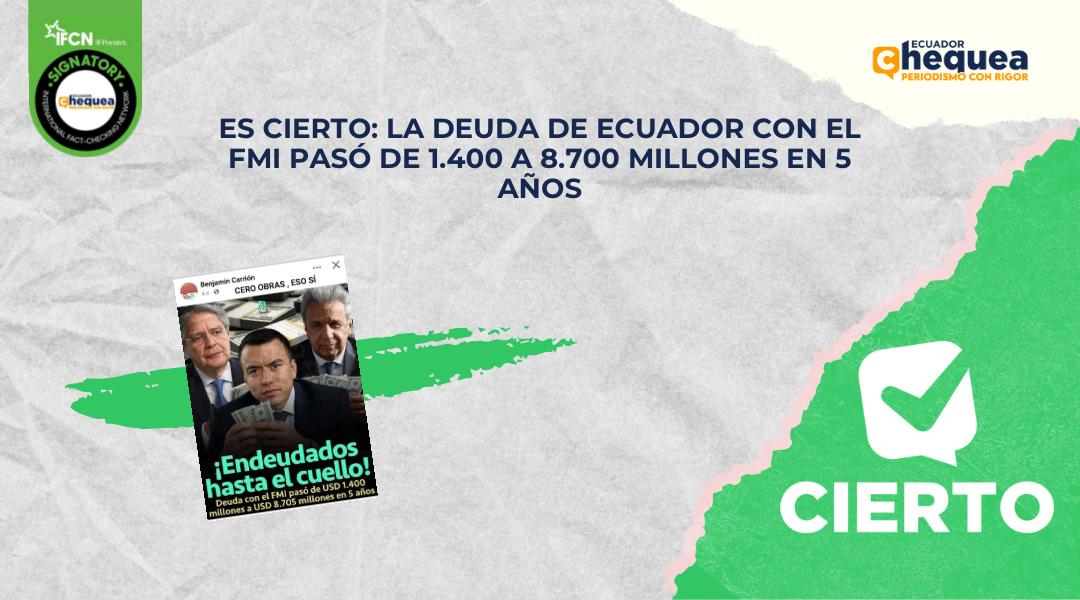 Bajo ese contexto, un post en Facebook asegura que la deuda de Ecuador con el FMI pasó de 1.400 a 8.700 millones en cinco años. Se califica este contenido como cierto.