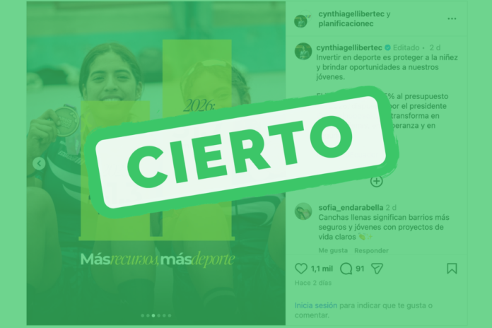 CIERTO. Con la información proporcionada, las piezas oficiales dicen la verdad al afirmar un incremento del 25% en el presupuesto de deporte al comparar 2025 (USD 41,3 millones) con la proyección 2026 (USD 51,7 millones), lo que implica USD 10,4 millones adicionales. No obstante, el mensaje omite contexto clave: en años anteriores el presupuesto codificado del sector habría sido más alto (por ejemplo, USD 62,1 millones en 2022 y USD 73,7 millones en 2023), por lo que la narrativa de “más recursos” no describe un techo histórico sino una subida interanual desde una base reciente baja (2025) y una dinámica de recuperación tras recortes.