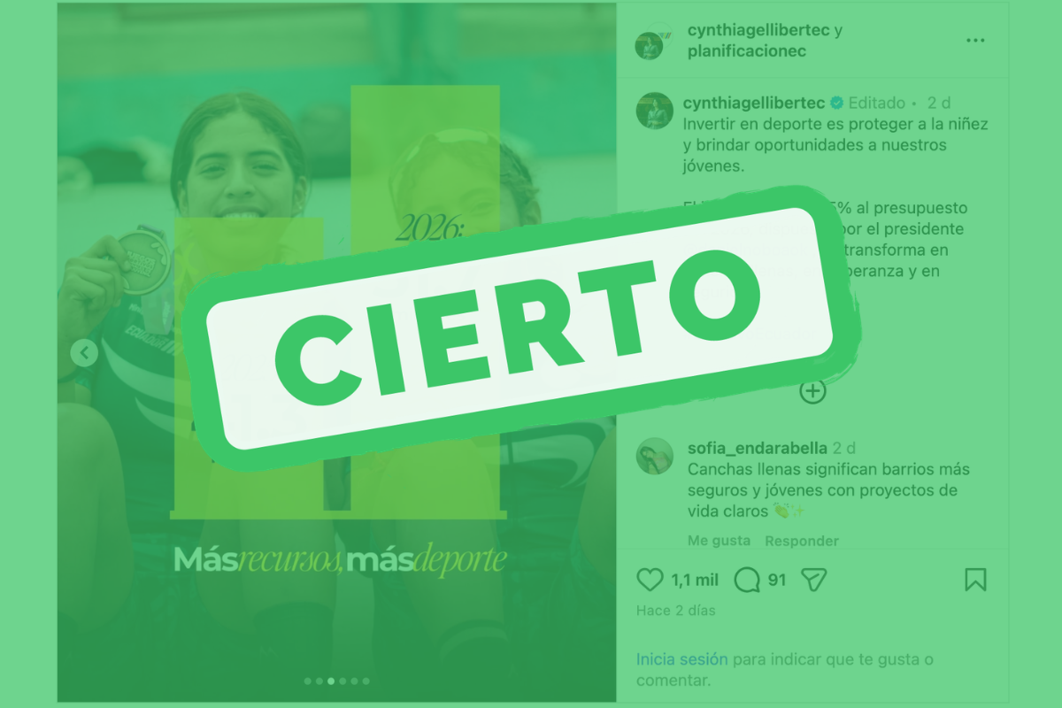Dos piezas de comunicación oficial difundidas en redes atribuyen a la Proforma General del Estado un incremento del 25% en el presupuesto destinado al deporte: de USD 41,3 millones (2025) a USD 51,7 millones (2026). Con los datos entregados para esta verificación, la operación es correcta y el aumento interanual equivale a USD 10,4 millones. Sin embargo, el mensaje omite que en años previos el presupuesto codificado del sector fue mayor (USD 62,1 millones en 2022 y USD 73,7 millones en 2023), por lo que el “más recursos” funciona como comparación contra una base baja reciente (2025) y no como un máximo histórico del financiamiento deportivo.