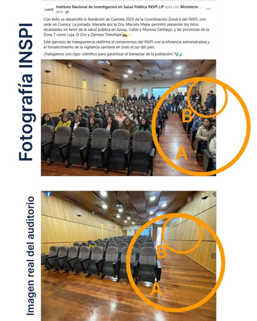 El Instituto Nacional de Investigación en Salud Pública (INSPI) difundió en sus cuentas oficiales una imagen de la rendición de cuentas 2025 de su Coordinación Zonal 6, en Cuenca, que no corresponde al estado real del auditorio.