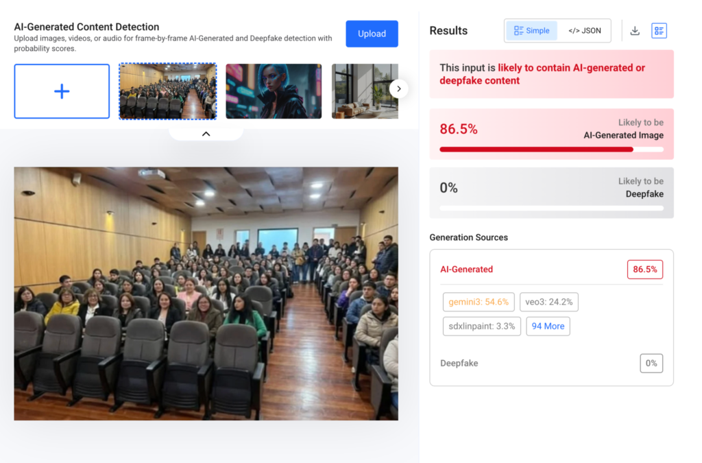 Por último, Ecuador Chequea analizó la imagen publicada por el INSPI con la herramienta de detección de IA, Hive Moderation, que identificó una probabilidad del 86,5% de que la imagen haya sido generada con este tipo de herramientas.